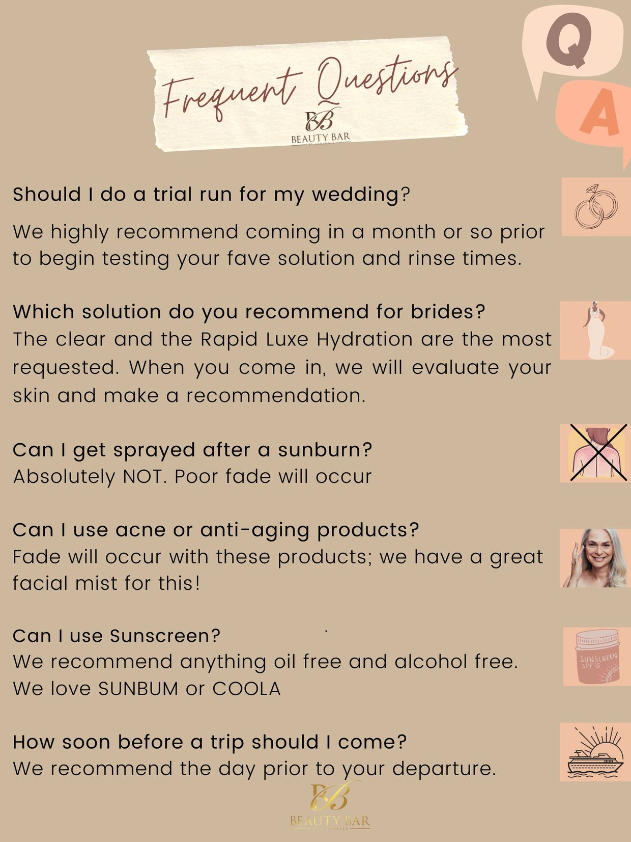 Please do not use OLAY, DOVE products prior to your tan, do not shave or shower the day of- or at least 4 hours prior. Shaving or showering right before your appointment can case a film to be left on the ski n, or alter your skin PH, therefore causing your tan to not develop as it should.
